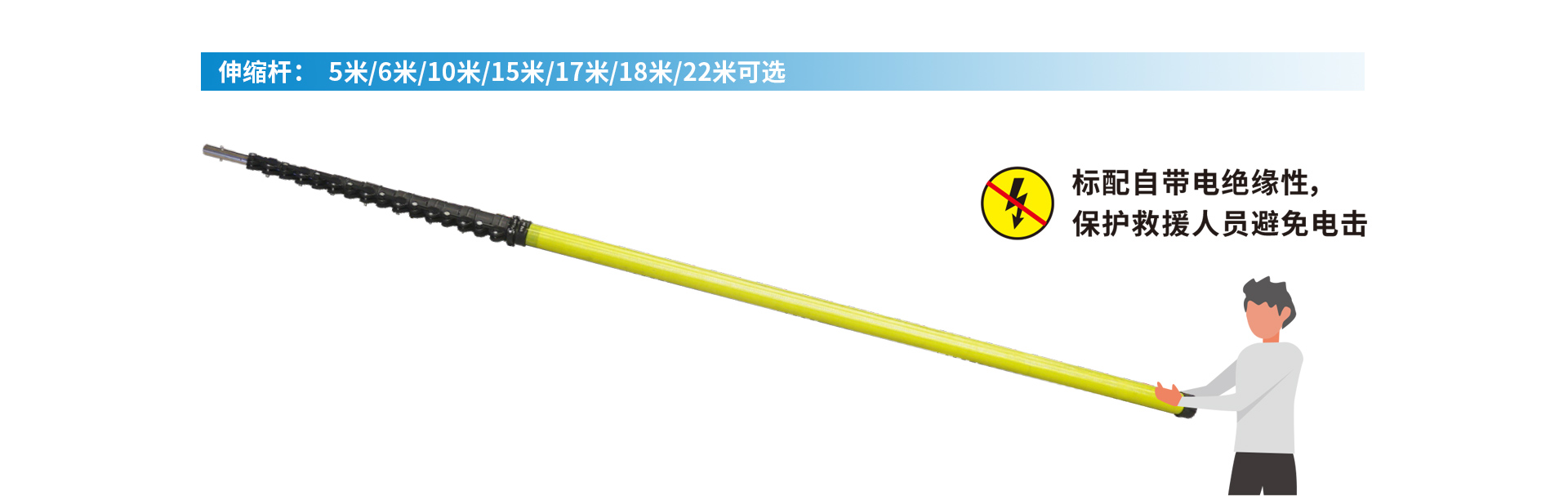 可以在任意水面上進行5米;6米;10米;15米;17米;18米;22米,快速救援有意識或者無意識人或者動物,減少人員傷亡的最有效工具,也大大降低了救援人員傷亡風險,提高救援效率,多功能救援頭可以根據救援環境,任意快速調換救援頭,達到最佳的救援效果;其中炭纖維伸縮桿在救援人員手握部位采用具有電絕緣性的玻璃鋼材質,電壓等級≥9.5KV,避免救援人員觸碰到高壓線等情況出現電擊,極大保障了救援人員的生命安全。