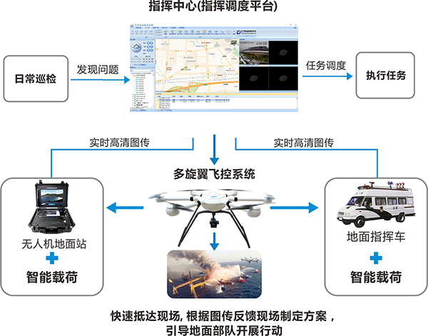 JTT無(wú)人機(jī)應(yīng)急指揮調(diào)度平臺(tái)將無(wú)人機(jī)飛行平臺(tái)與其他業(yè)務(wù)系統(tǒng)無(wú)縫隙地連接成一個(gè)有機(jī)整體,解決無(wú)人機(jī)在執(zhí)法單位應(yīng)用中存在的技術(shù)難點(diǎn)及應(yīng)用盲區(qū)。